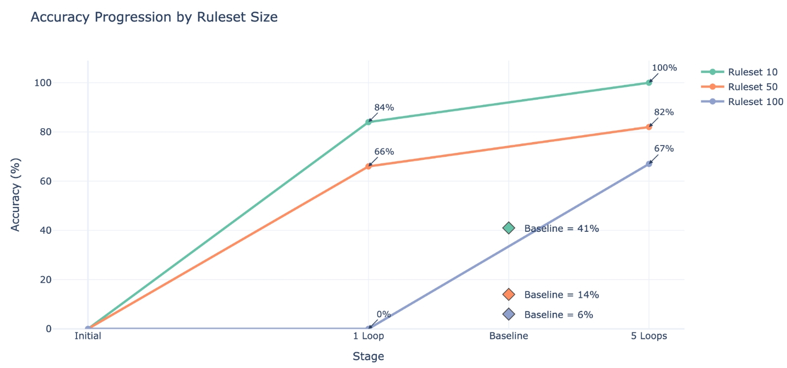 We started off with a prompt that resulted in webpages that didn’t follow any of the rules at all. In just 1 loop -> high accuracies like 84 or 66 based on the number of rules we were checking In just 5 loops -> even higher accuracies. This shows that prompt learning allows LLMs to learn new rules, even up to 50/100 rules for a certain task, when at first it didn’t know any of them.