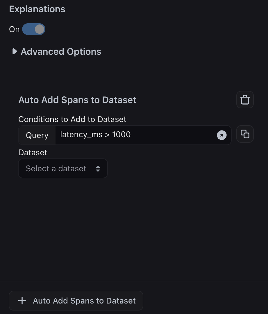 Alternatively, instead of using an evaluation label, you can add any example to a dataset that meets basic filter criteria, such as high token count in the LLM output, high latency, or examples where a specific tool was called.