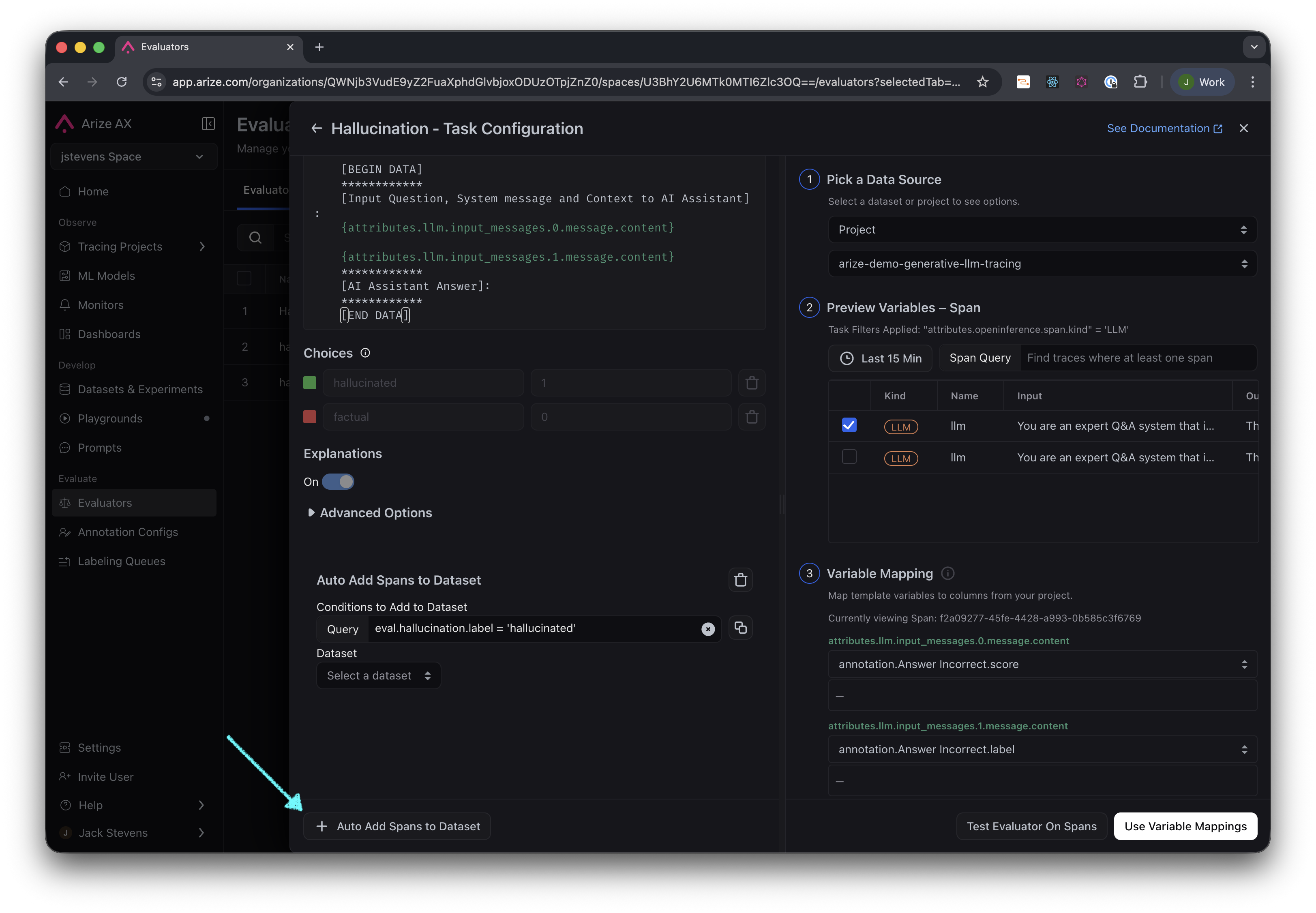 After setting up an evaluation task on a project, you can include a post-processing step that automatically adds examples to a dataset based on the evaluation label. First you need to edit the configuration of the Evaluator for your task: