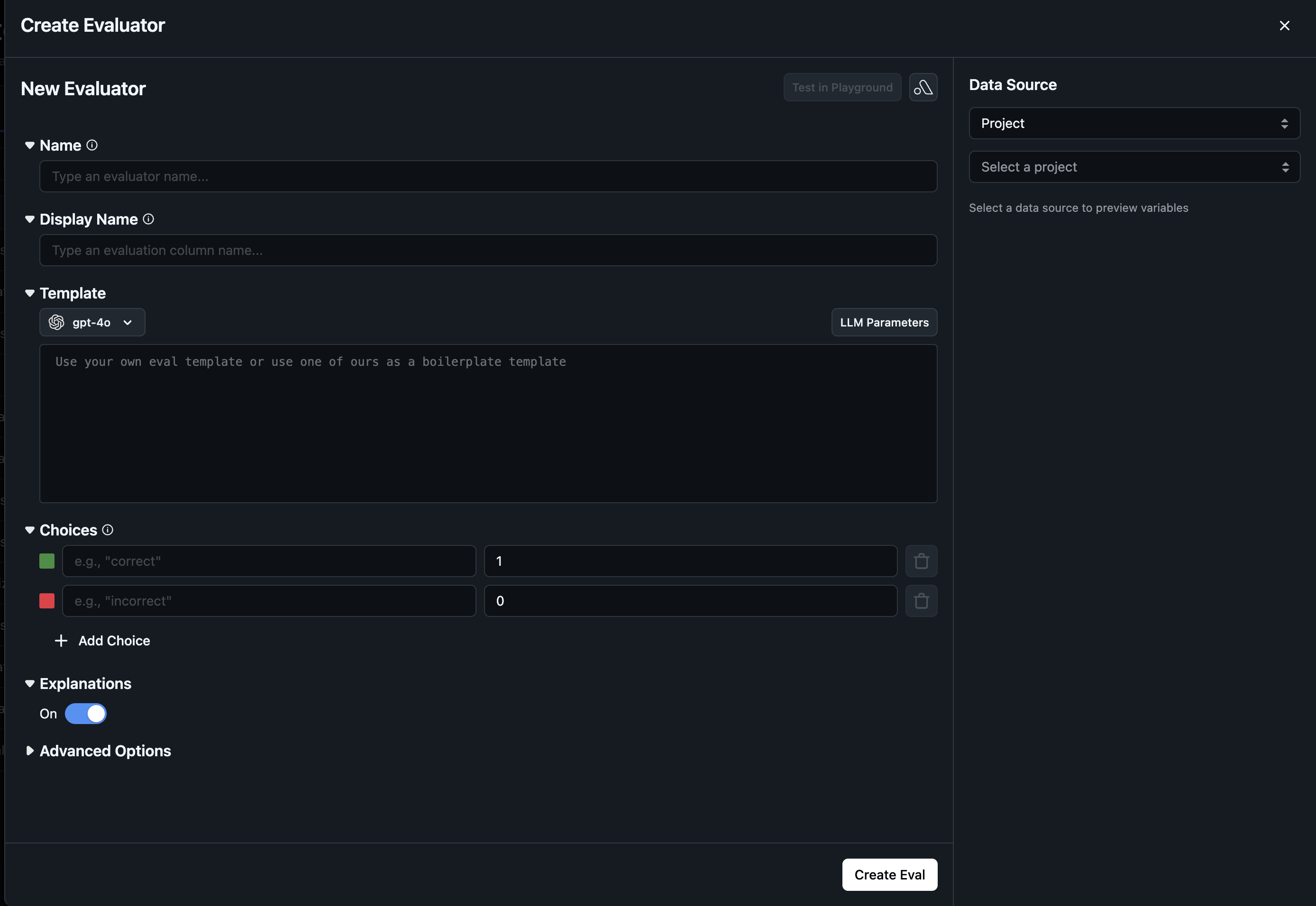 - Template: Write your evaluation prompt template with variables (e.g.,