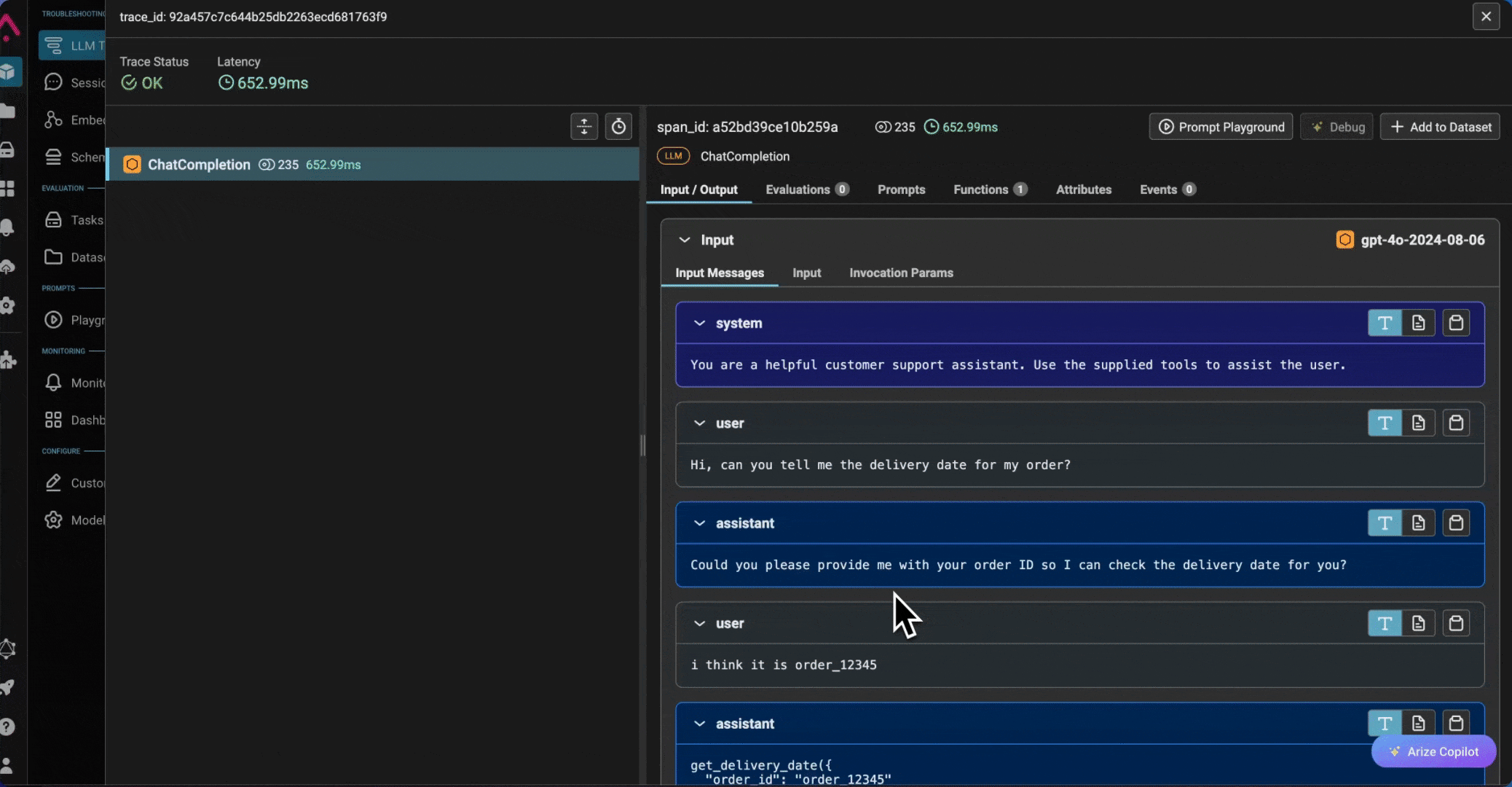 Now that you have tracing setup, all invocations of OpenAI (completions, chat completions, embeddings) using the instrumented client will be streamed to your Arize account for observability and evaluation.