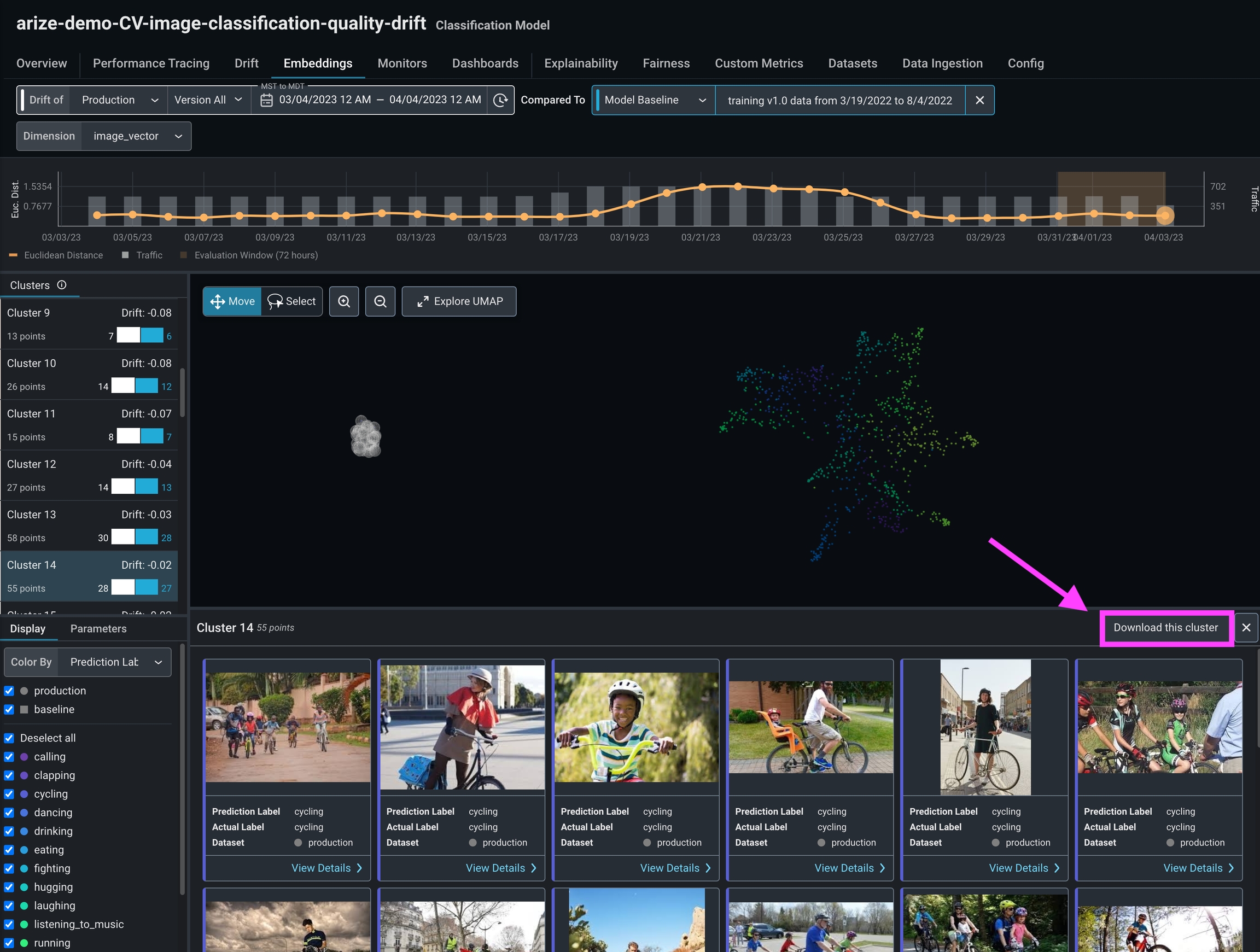 Once a cluster that is impacting model performance has been identified, users can download the data in the cluster for active learning. This data includes all the information needed for labeling workflows. These clusters are highly focused groups of datapoints, enabling labeling teams to be more precise in their efforts.