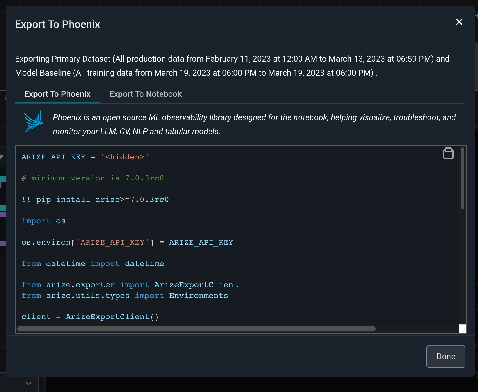 Arize enables teams to continue analysis of their production data in notebooks. With a few lines of Python code, users can export their data into Phoenix or a Jupyter notebook for further analysis.