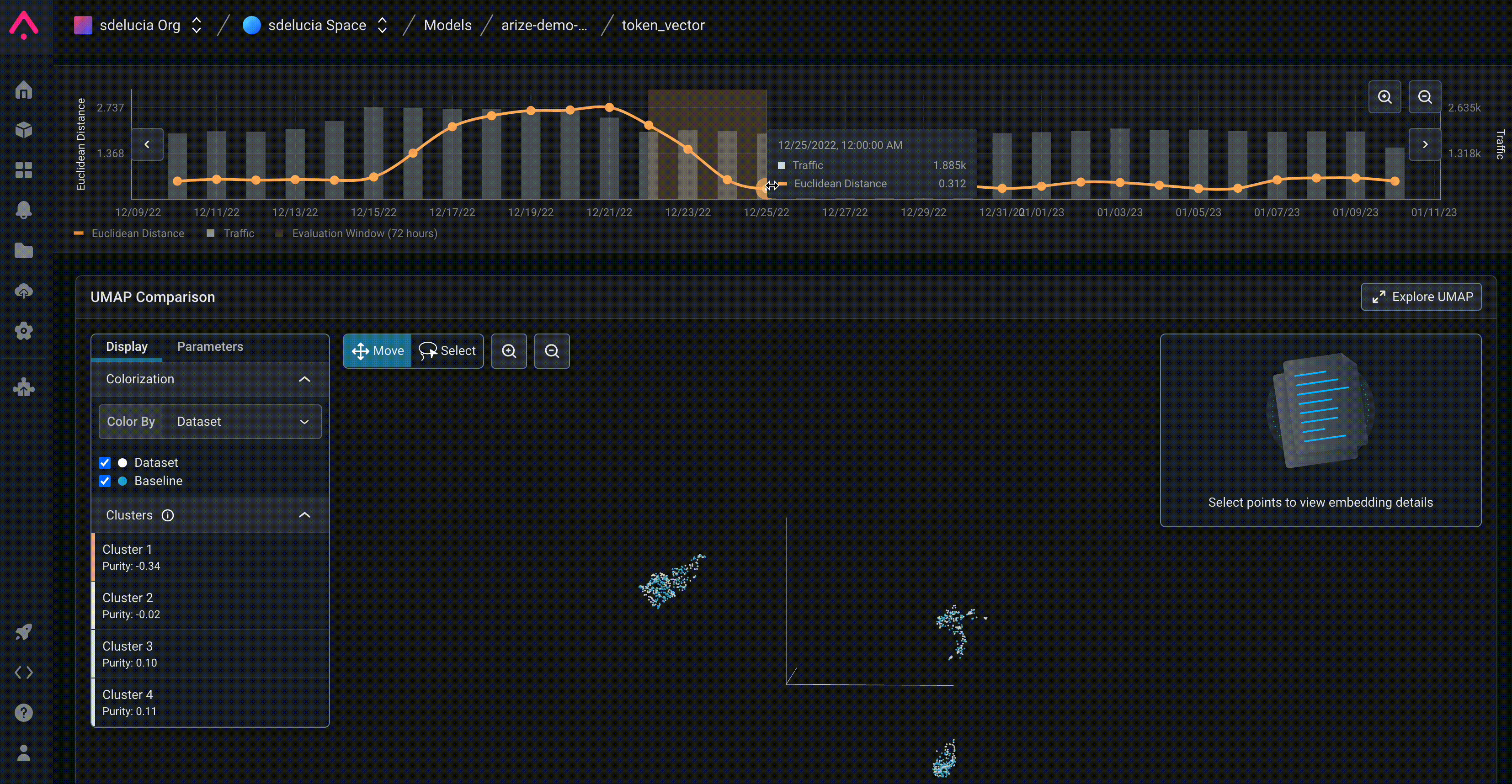 - Select a point on the drift visualization at the top of the page and generate UMAP to visualize the point in time selected