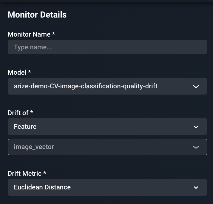 You can set a euclidean distance monitor using the UI or through our Monitors API. By creating a monitor and selecting the embeddings feature of interest, Arize AX can track and monitor your embeddings for drift. \
