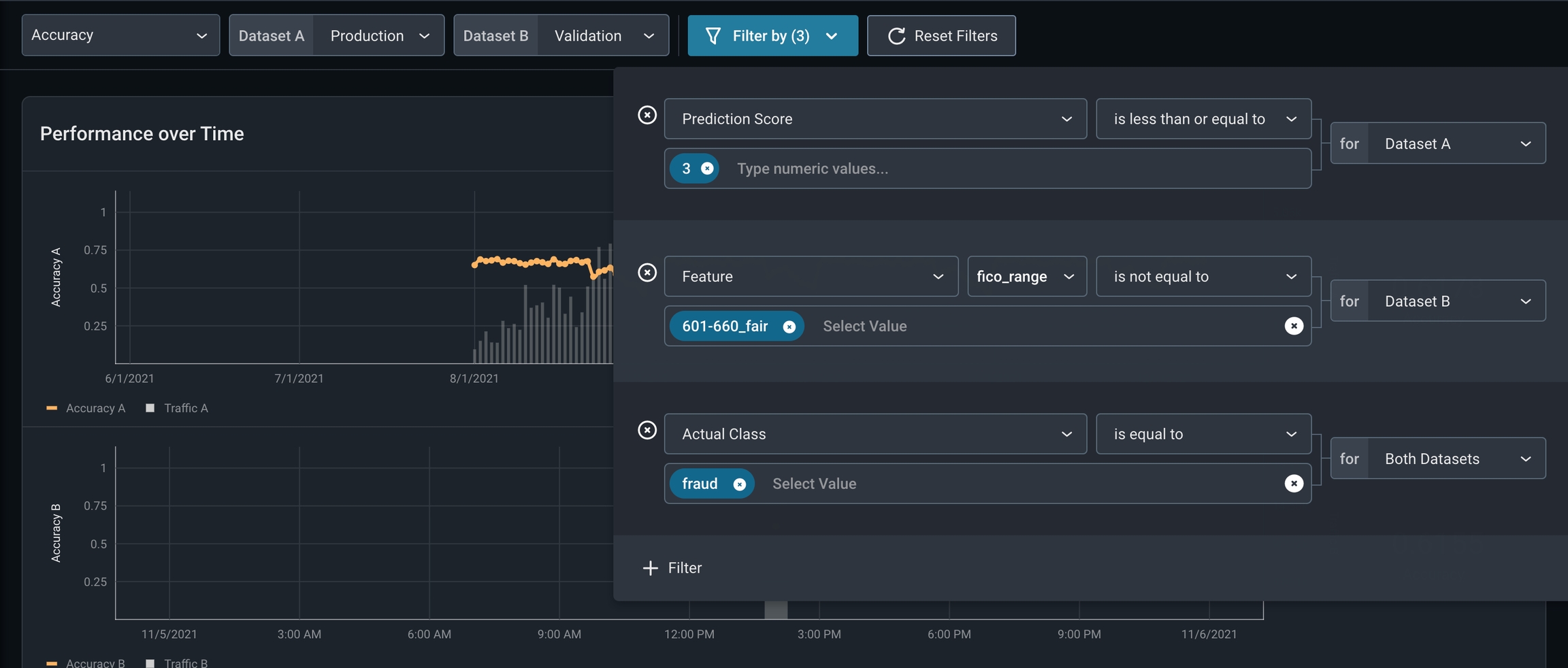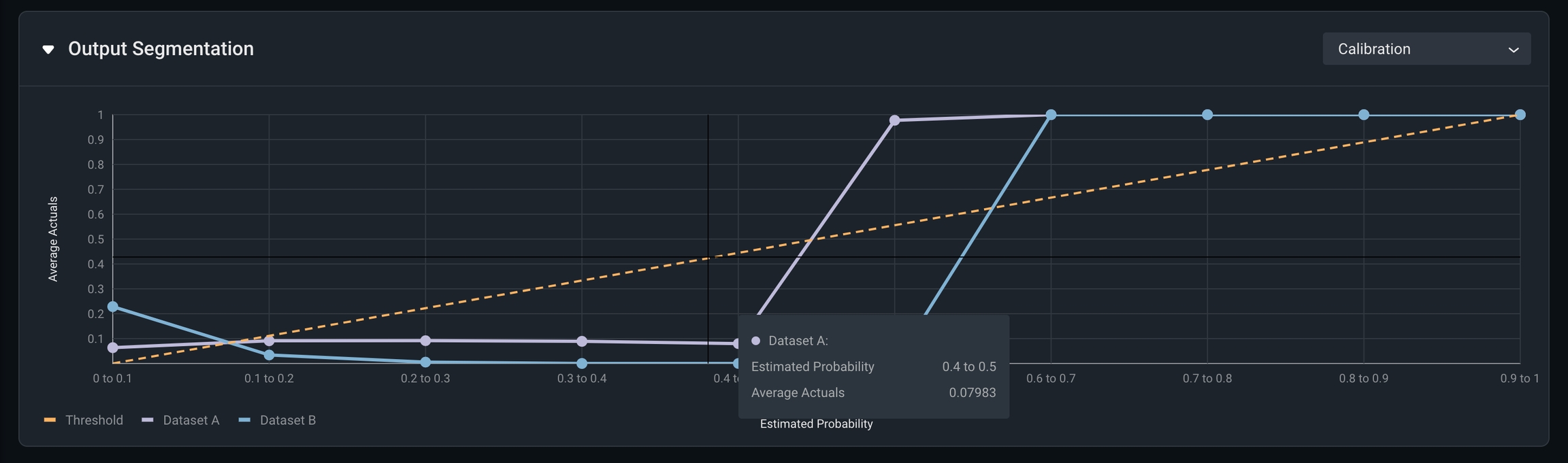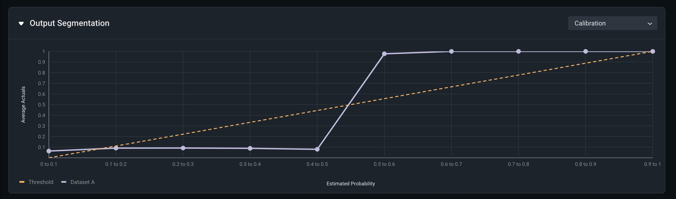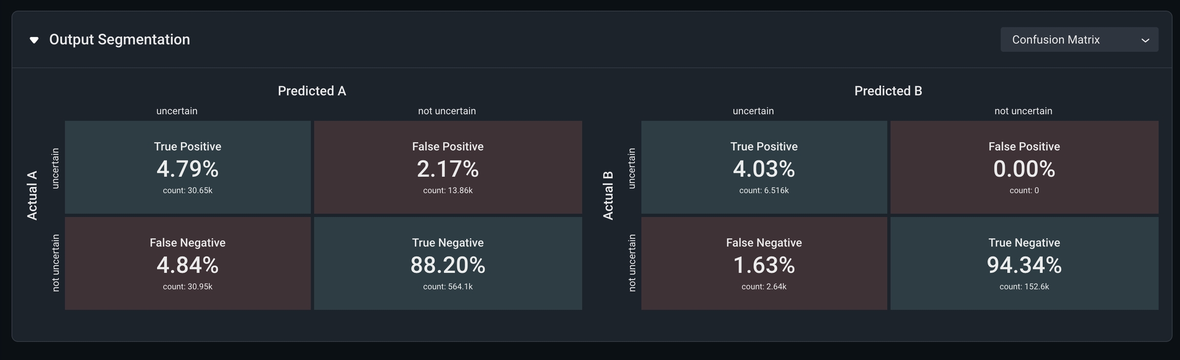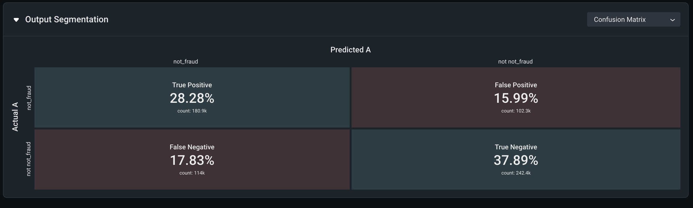 Model Performance Tab: Output Segmentation Analysis**Confusion Matrix - **Given a model is set up with a default positive class (set this up on the config tab), we generate a matrix showcasing TF, FP, TN, FN counts of the dataset(s) to easily visualize model performance issues.