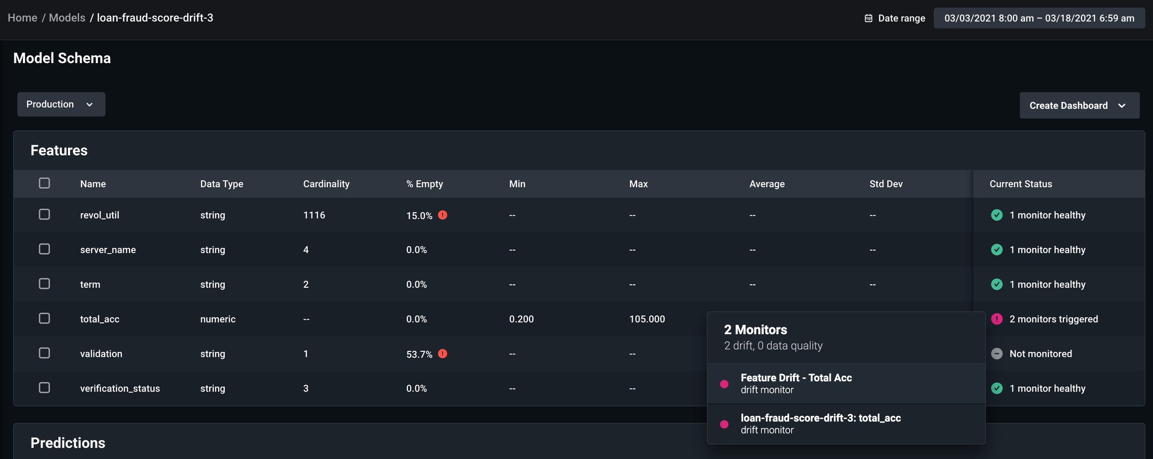 We added the ability to quickly see which alerts are triggered/healthy without having to directly visit the Monitors Page. You can now see a consolidated view of a model’s health from the Model Page.