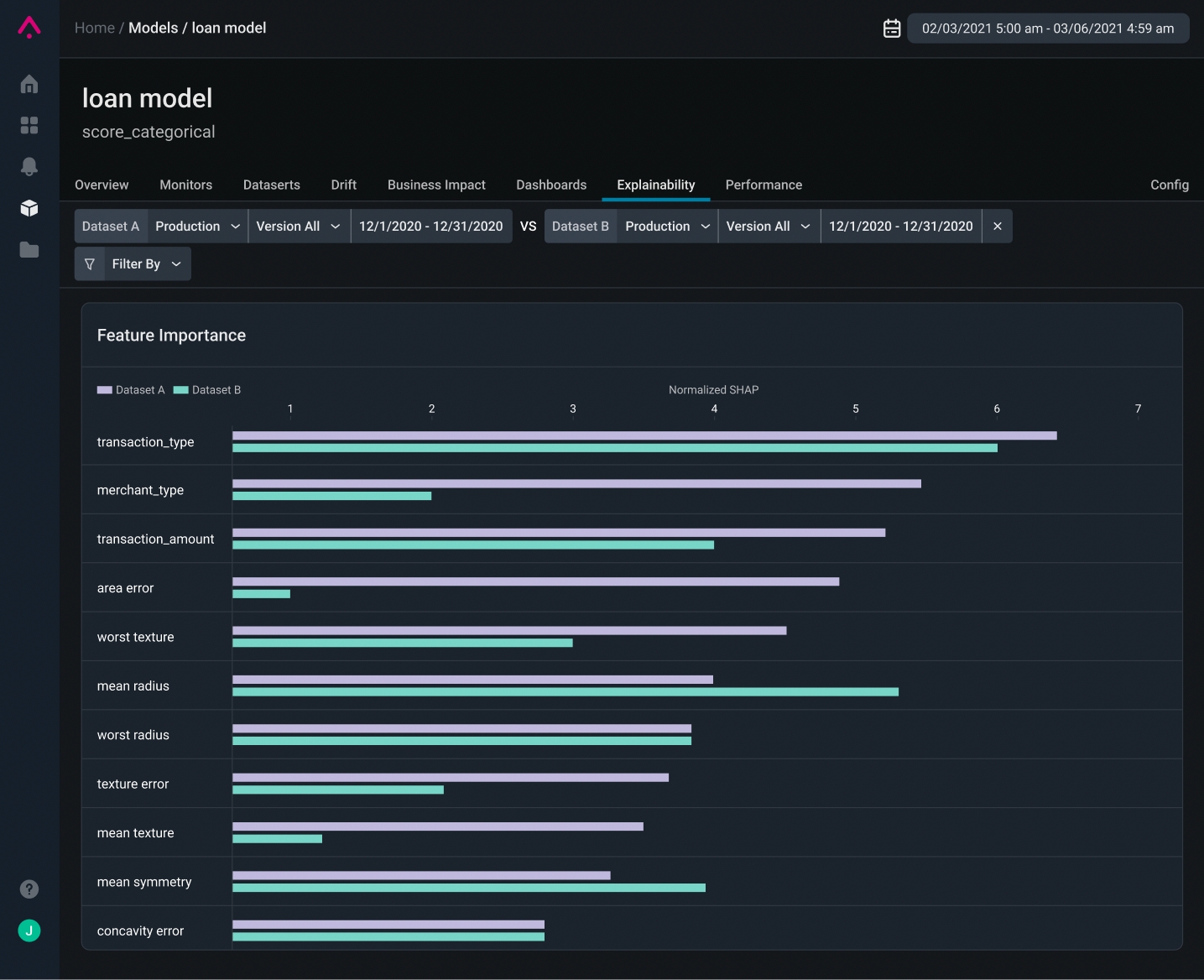 Explainability Filtering and Dataset ComparisonsCompare two production datasets to easily visualize a change in feature importance between different datasets and versions.Learn more about model explainability here.