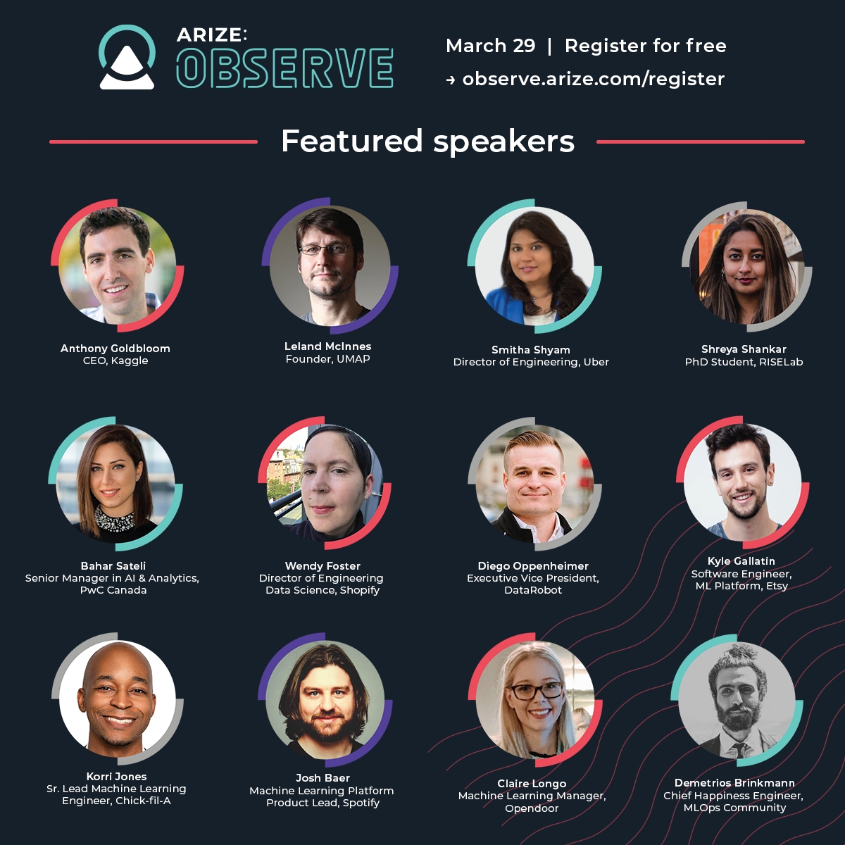 Announcing Arize:Observe - The Virtual ML Observability Summit!Join us on March 29th for Arize:Observe - The Virtual Machine Learning Observability Summit. Arize:Observe sessions spans from MLOps basics to the most sophisticated AI/ML use cases led by ML leaders from companies like Shopify, Uber, Etsy, Kaggle, DataRobot, Chick-Fil-A, and more! Learn More.