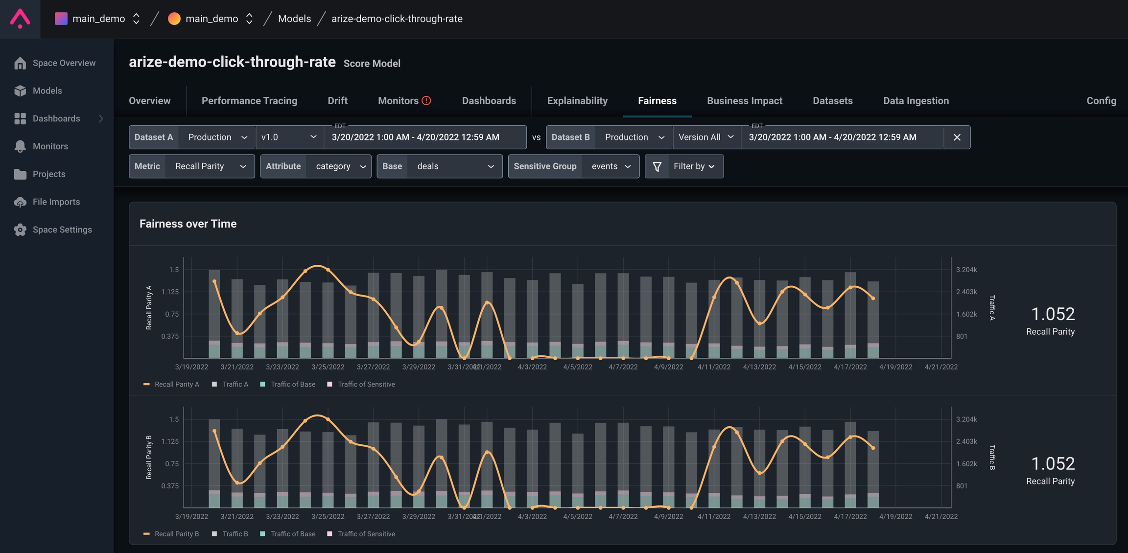 Analysis of Fairness MetricsYou now have the option to analyze fairness metrics for your models in Arize’s platform. Gain insights into whether your model is generating potentially biased or unfair outcomes for segments of interest using three fairness metrics: Recall Parity, False Positive Rate Parity, and Disparate Impact. Learn more about using this feature here.
