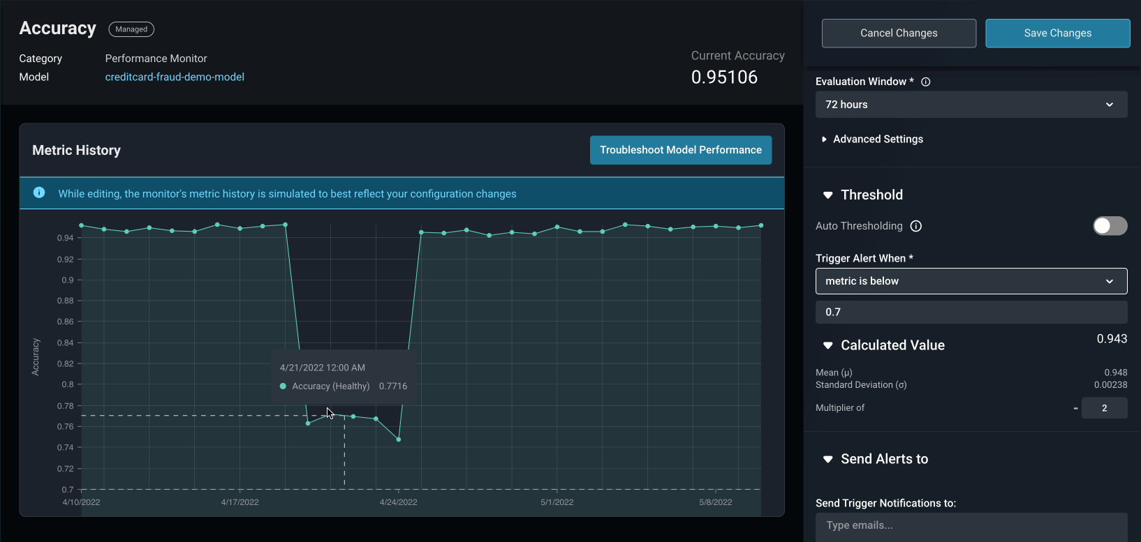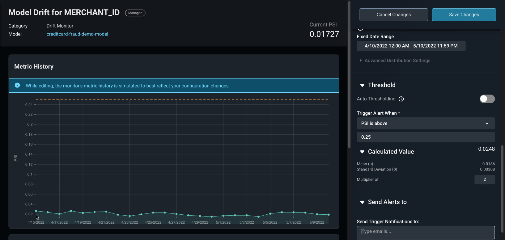 Automatic Thresholds for MonitorsThe Arize platform now automatically populates monitoring** **thresholds for both **Drift Monitors and Performance Monitors. **A monitor’s threshold is the value that is compared against your model’s current calculated metric value. Thresholds are used to trigger an alert when the current value of a metric is eitherabove or below a model’s threshold value.Automatic thresholds help ML teams scale their ML needs, reduce time to resolution, and increase overall workflow efficiency.Drift MonitorsArize sets automatic drift thresholds for both prediction drift and feature drift. An automatic threshold is determined when there is sufficient production data to determine a trend.Learn more about automatic baselines here, drift monitors here, and how automatic thresholds for drift monitors are calculated here.