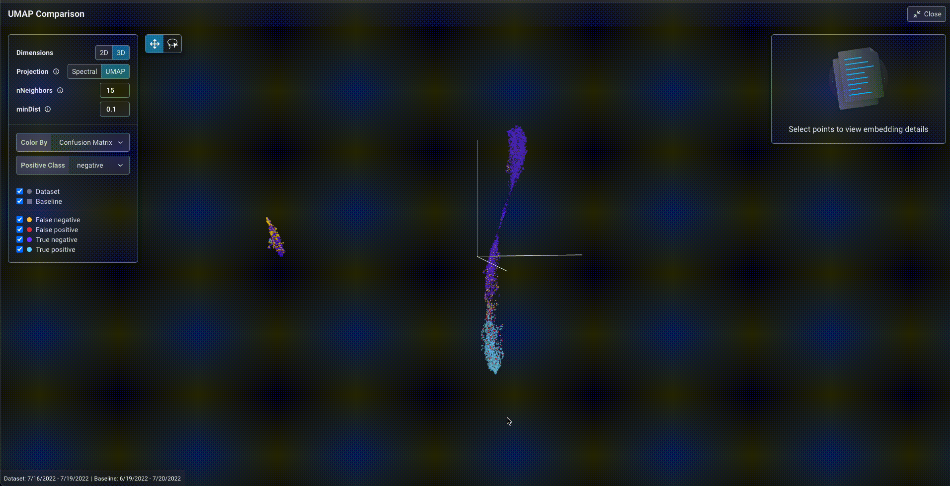 Color by Confusion Matrix is now available for the UMAP point cloud to bring performance troubleshooting to Embeddings. You can now select a Positive Class and get a high-level overview of performance and drift in the UMAP visualization.