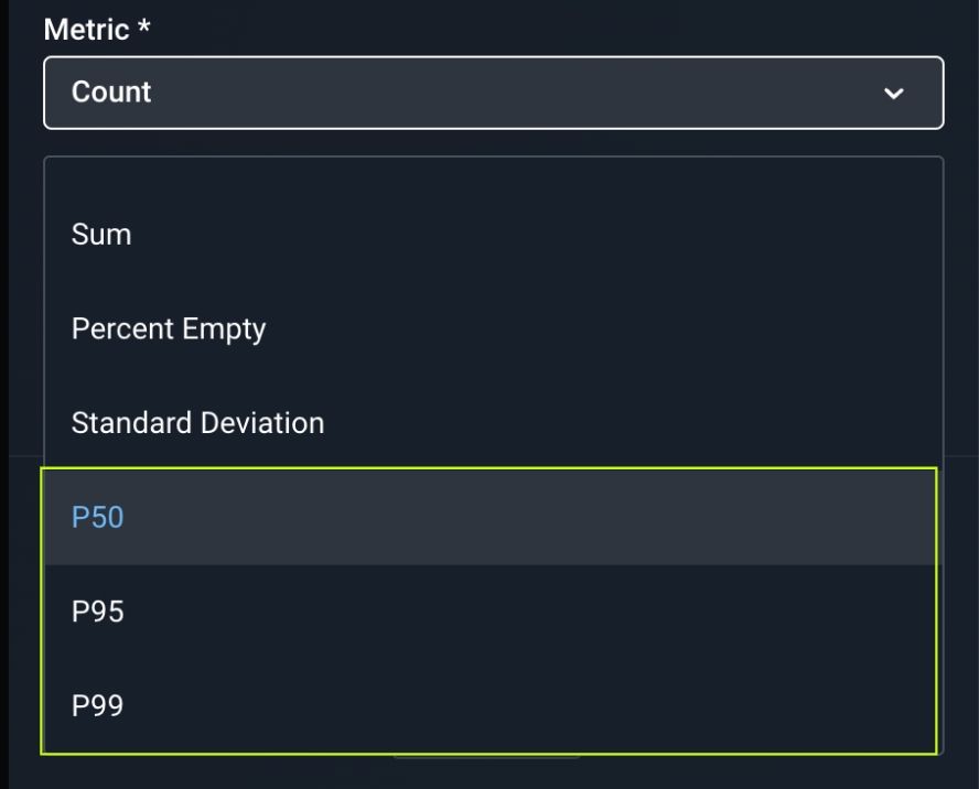 Evaluate P50, P95, and P99 for data quality monitors to gain a more representative understanding of both your median and outlier data performance.Learn more about data quality monitors here.