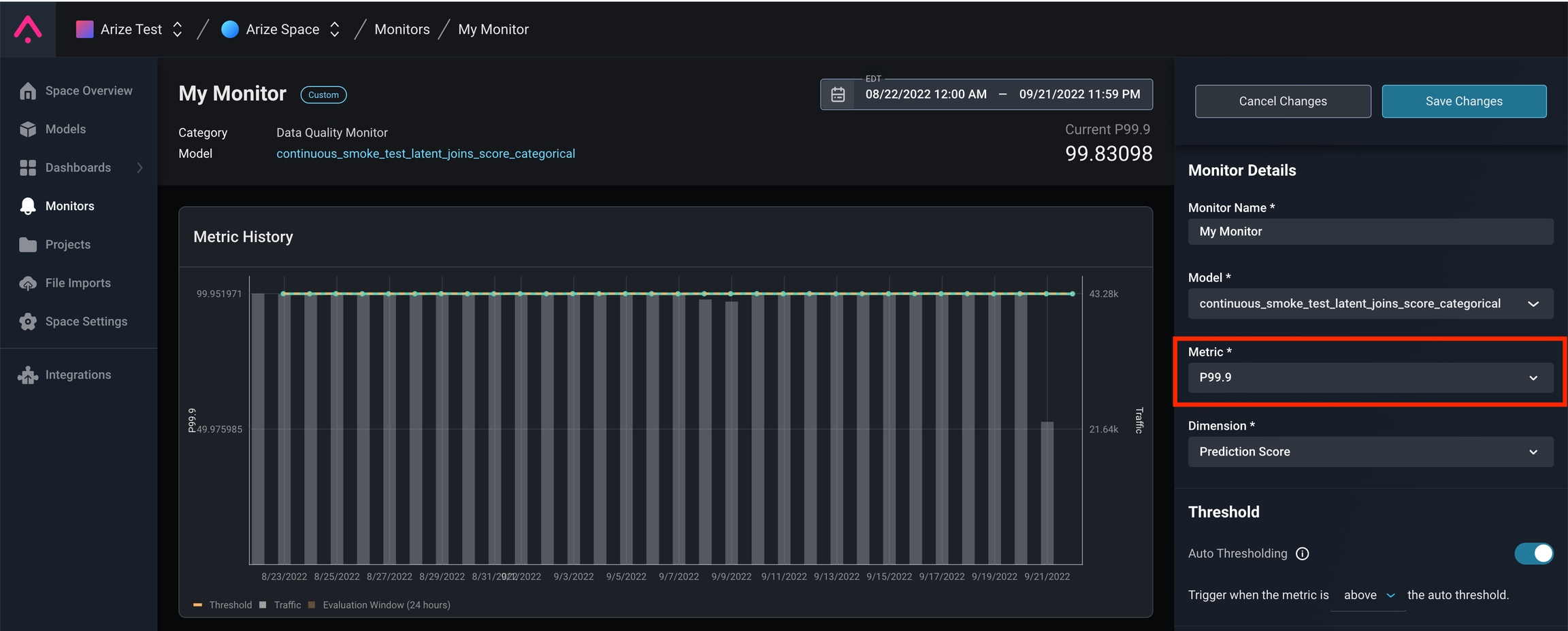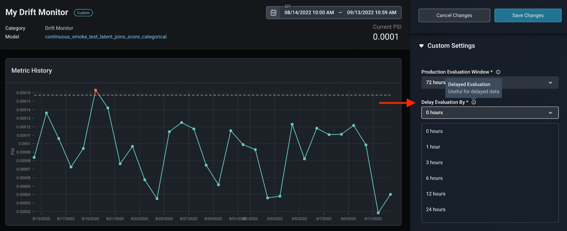 Accurately evaluate drift on delayed data by configuring your ‘Delay Evaluation By’ setting. Navigate to the ‘Edit Monitor’ page under ‘Custom Settings’ to pick from a wide breadth of time windows relevant to your data.Learn more about an evaluation window here.