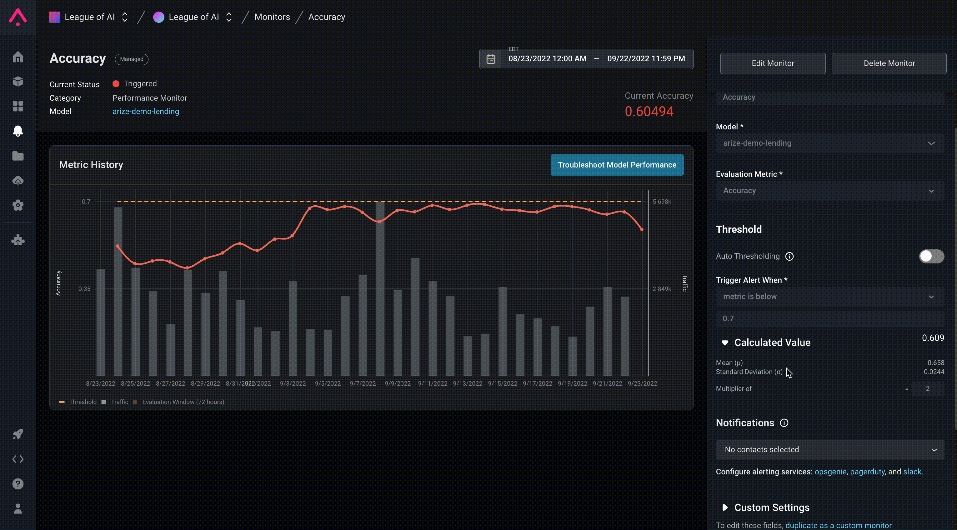 Set up an alerting integration directly from the ‘Edit Monitor’ page to streamline your monitoring workflow. This enables increased flexibility to configure an integration specific to your alerting needs.Pick from our native integrations with Pagerduty, Slack, or OpsGenie.Do you use an alerting system not represented yet? Contact support@arize.com or reach out to us on Slack for options.