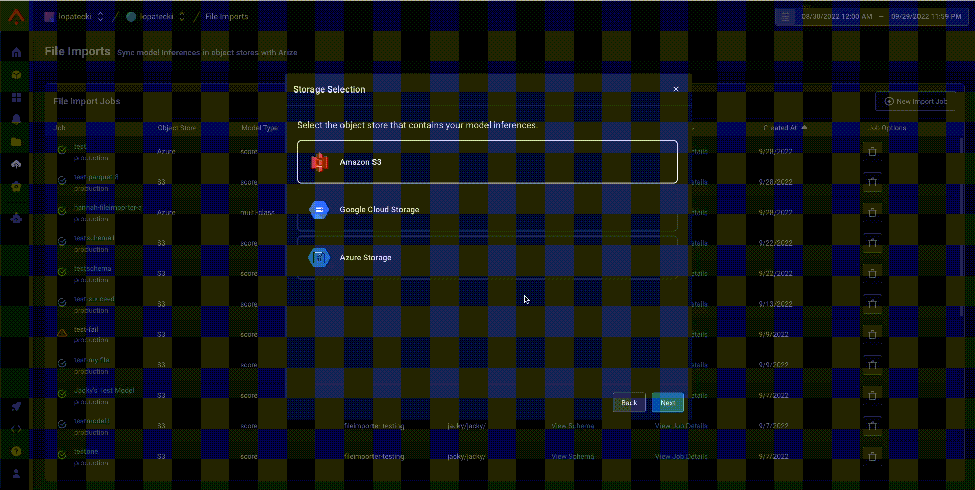 Send data through Azure blob storage to automatically extract data from Azure to Arize. Seamlessly log model inferences in a few simple steps: connect your Azure storage account, set up containers, and enter your secret key to begin monitoring and troubleshooting with Arize.Learn how to set up an import job from Azure here.