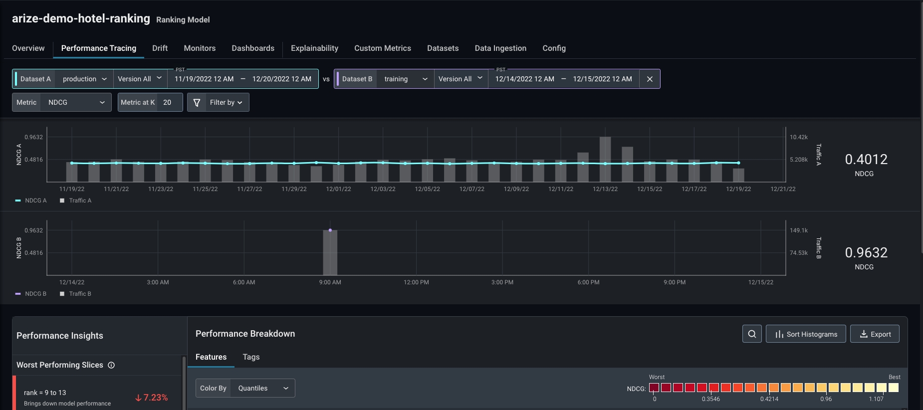 arize-hotel-demo-ranking model in the product quickstart guide for a tutorial on troubleshooting model performance using NDCG @ k.