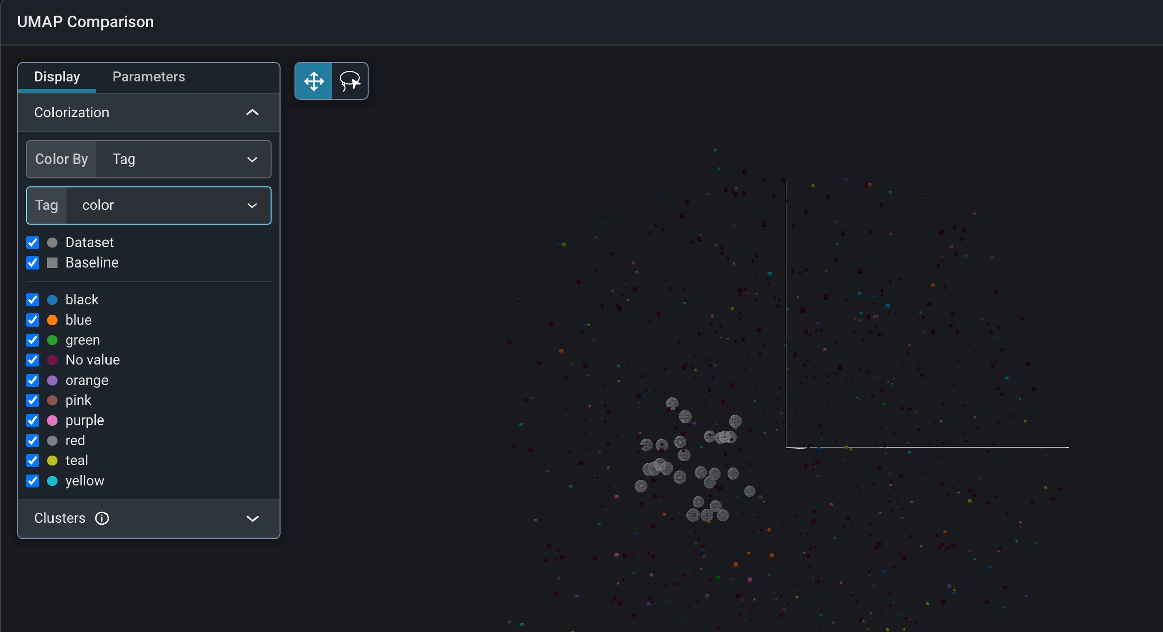Color the UMAP point cloud by tag and view details to uncover more information about your embedding drift.