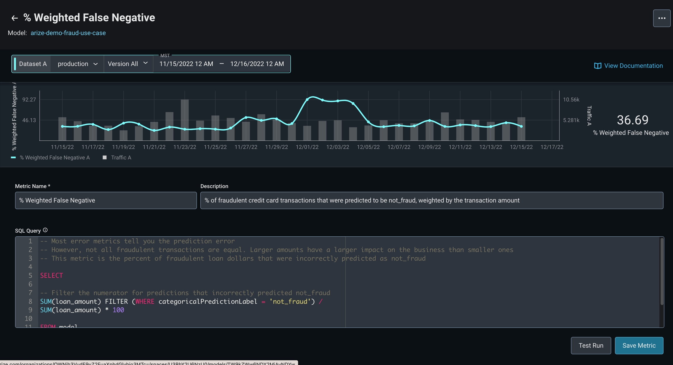 Custom metrics enable you to define any metric using a combination of existing model dimensions and functions. Written using a SQL-like query language, create custom metrics by combining your model’s inference data (features, predictions, actuals, etc.) using aggregations, operators, and metric functions. Use custom metrics across the platform in dashboards and monitors to share with stakeholders and receive alerts when your metric deviates from expected values.Learn how to create custom metrics here.