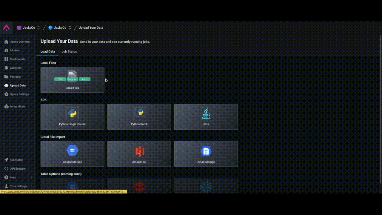 Upload a local file directly through the UI on the ‘Upload Data’ page. Use Local Upload to verify the schema for a sample of your data and quickly onboard a model. This feature supports CSV, Parquet, and Avro files. Learn how to upload a filehere.Note: Local File Upload is limited to one 30MB file at a time.
