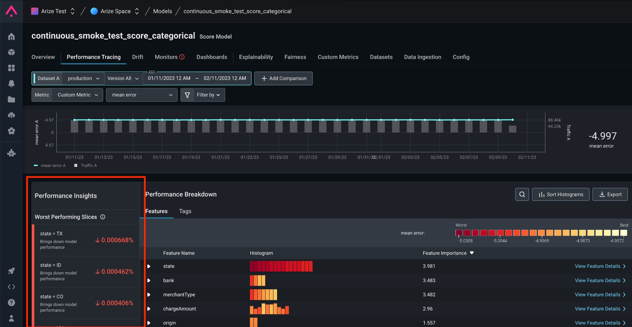 Performance insight support for models evaluated using a custom metric. Surface a list of your model’s worst-performing slices for faster root cause analysis.Performance insights are automatically populated in the ‘Performance Insights’ card on the ‘Performance Tracing’ tab.