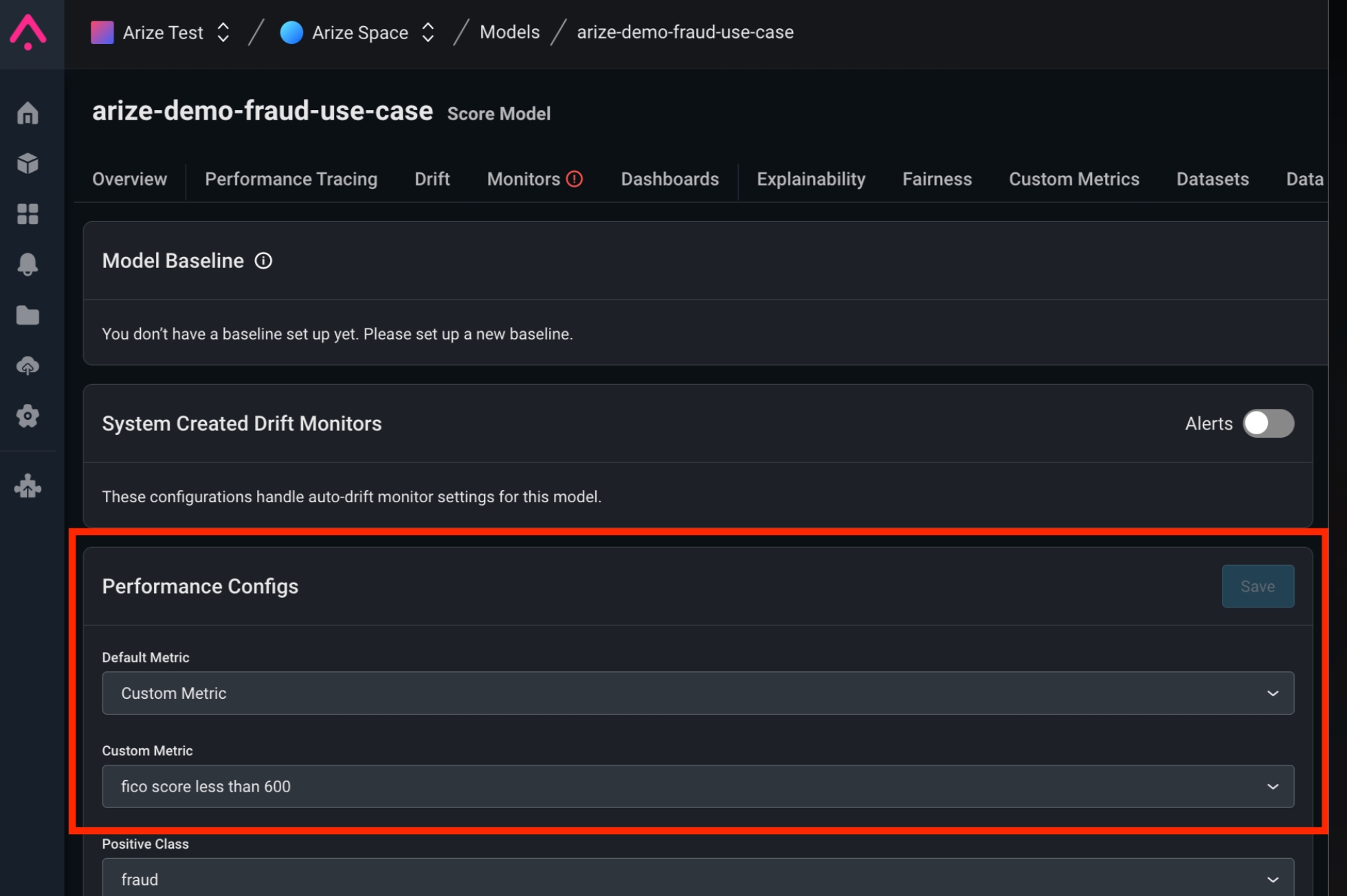 Select a custom metric as your default performance metric to auto-populate a custom metric throughout the platform (performance tracing, drift, dimension details, and monitor views).Navigate to the ‘Config’ tab to pick from a custom metrics dropdown menu.