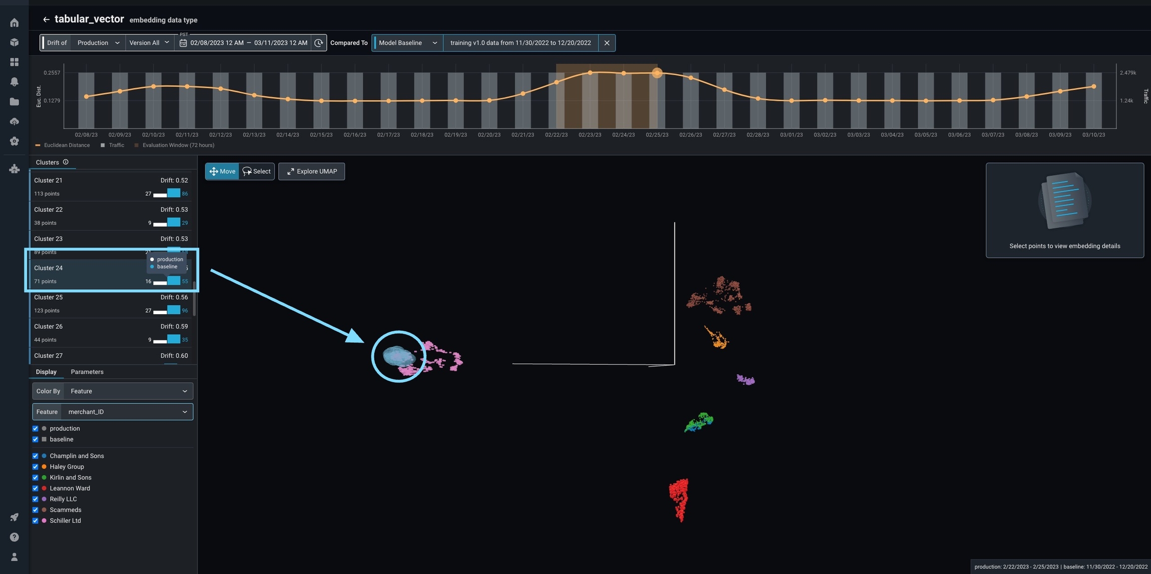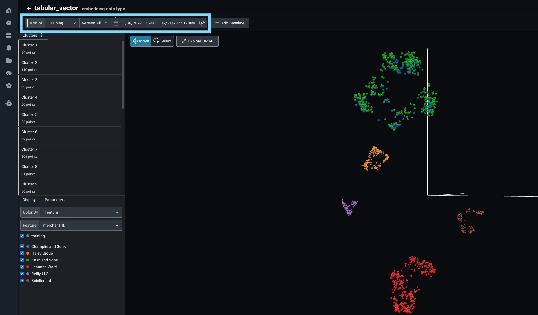 Quickly identify model drift by comparing the number of points between your primary dataset and your baseline. Learn more about clusters here.