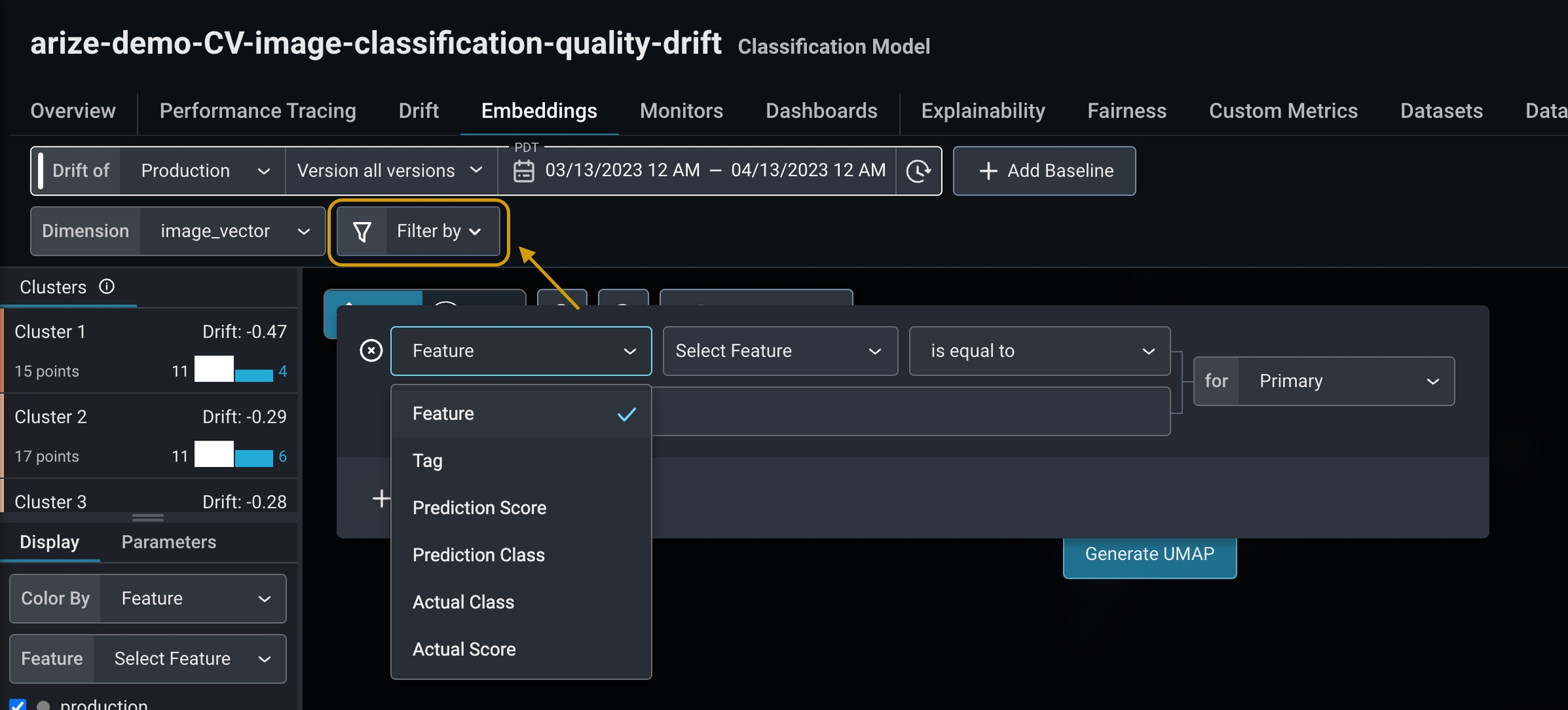 Gain a better visual understanding of your data, and discover new insights with UMAP filters. Use filters to focus in on a specific slice of your data in prior to generating the UMAP.