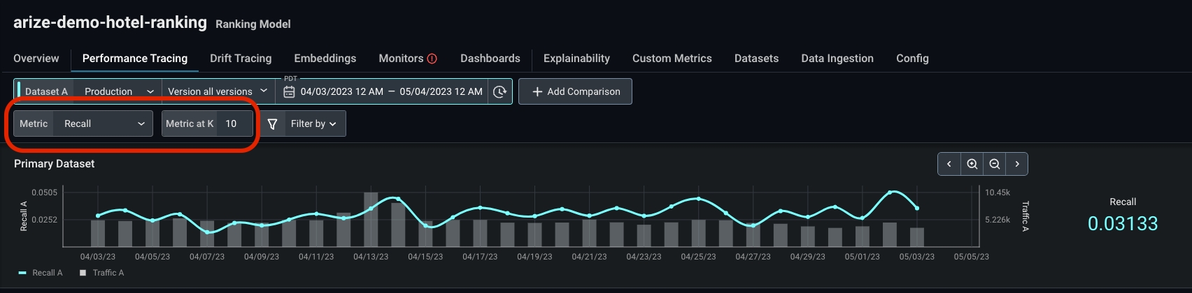 Use precision or recall @ k for a ranking model to evaluate how accurately the model retrieves relevant items within the top-k results. Focus on either the proportion of true positives (precision) or the proportion of true positives among all relevant items (recall).