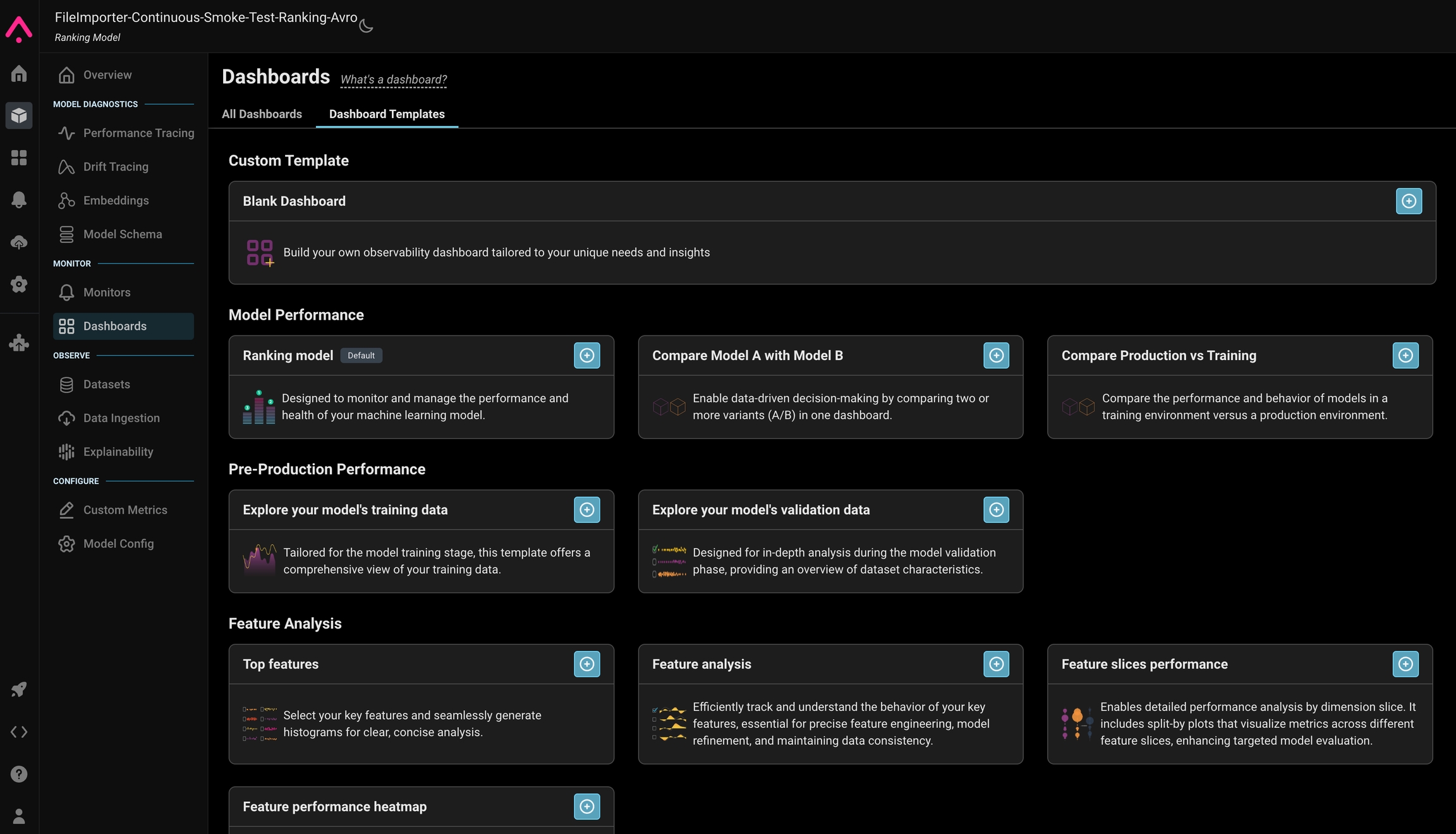 The model overview dashboards tab has gotten a new look! You can now find all supported templates for any model type in the new “Dashboard Templates” tab. Improvements include:- search by dashboard name in the “All Dashboards” view