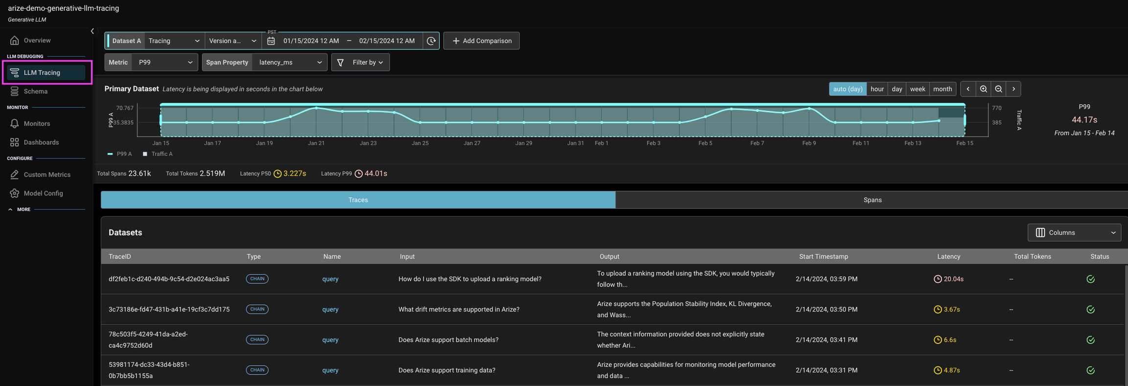 LLM Tracing is now available to all users in the Arize platform! With LLM traces and spans, you can glean visibility into the discrete executions of your LLM-based applications. Instrument LLM tracing as part of a retrieval augmented generation (RAG) or agentic (e.g. LangChain or LlamaIndex) system to improve your able to detect issues and troubleshoot them in an intuitive UI. Learn more →