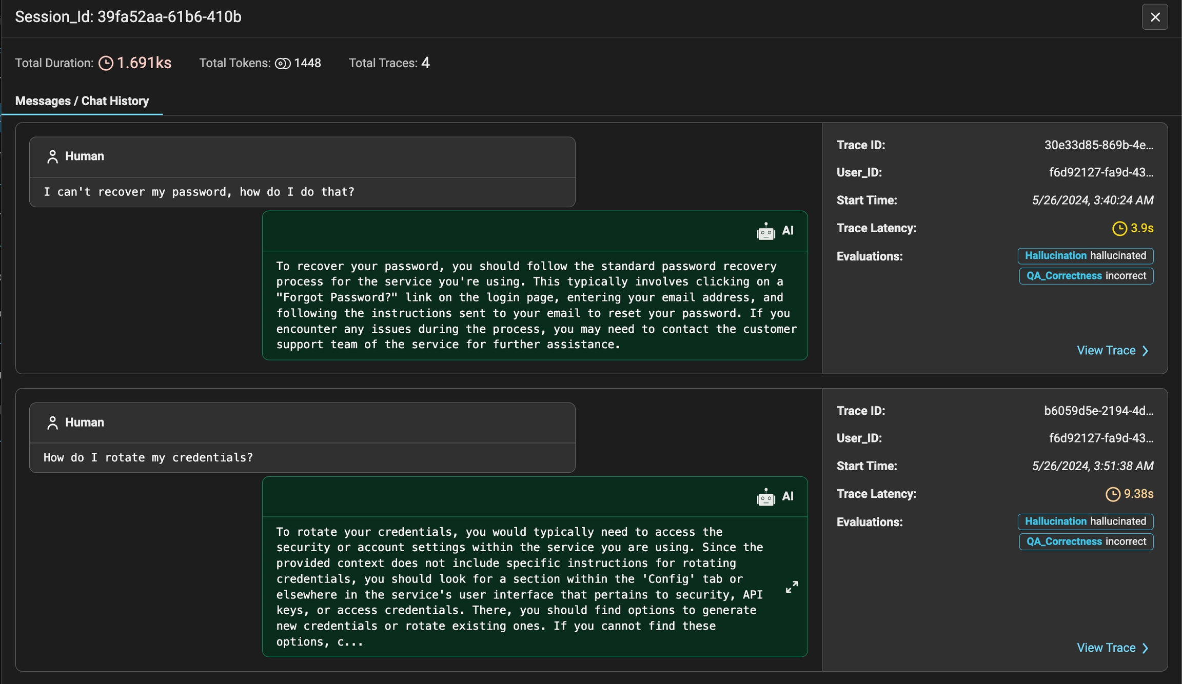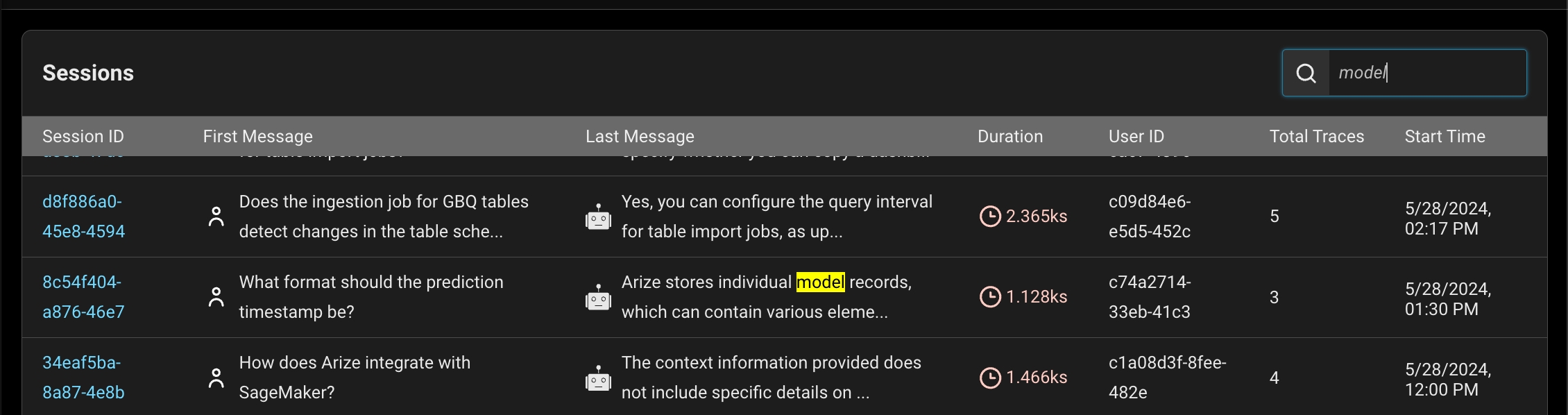 Searching a string in the Sessions UI finds matching messages across a session containing the string.