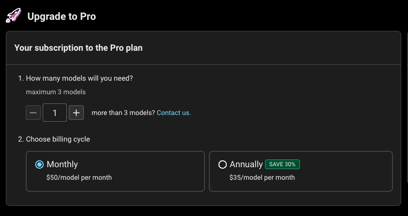 Easily upgrade from Free to Pro by navigating the “Plans and Usage” page, selecting change plan, and entering your billing details. Pro users can observe multiple models with larger volume, receive additional support, and unlock longer data retention.