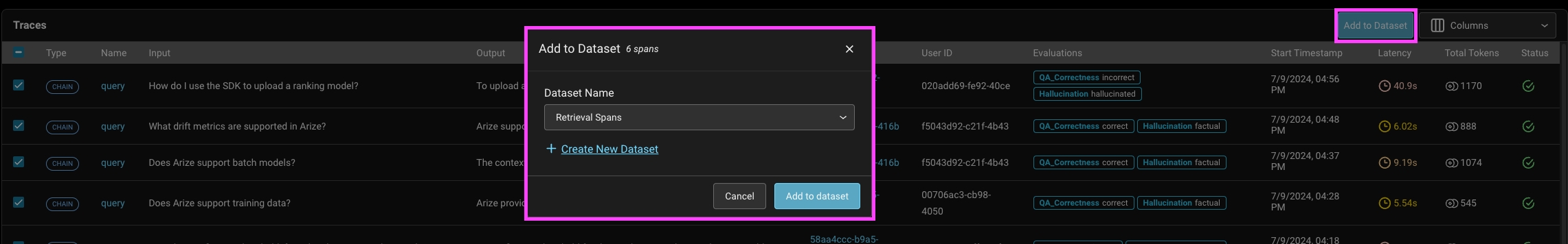 Datasets are collections of examples that are used to run experiments, label, or evaluate the performance of an application. Users can easily add selected examples to a new or existing dataset. Learn more ->