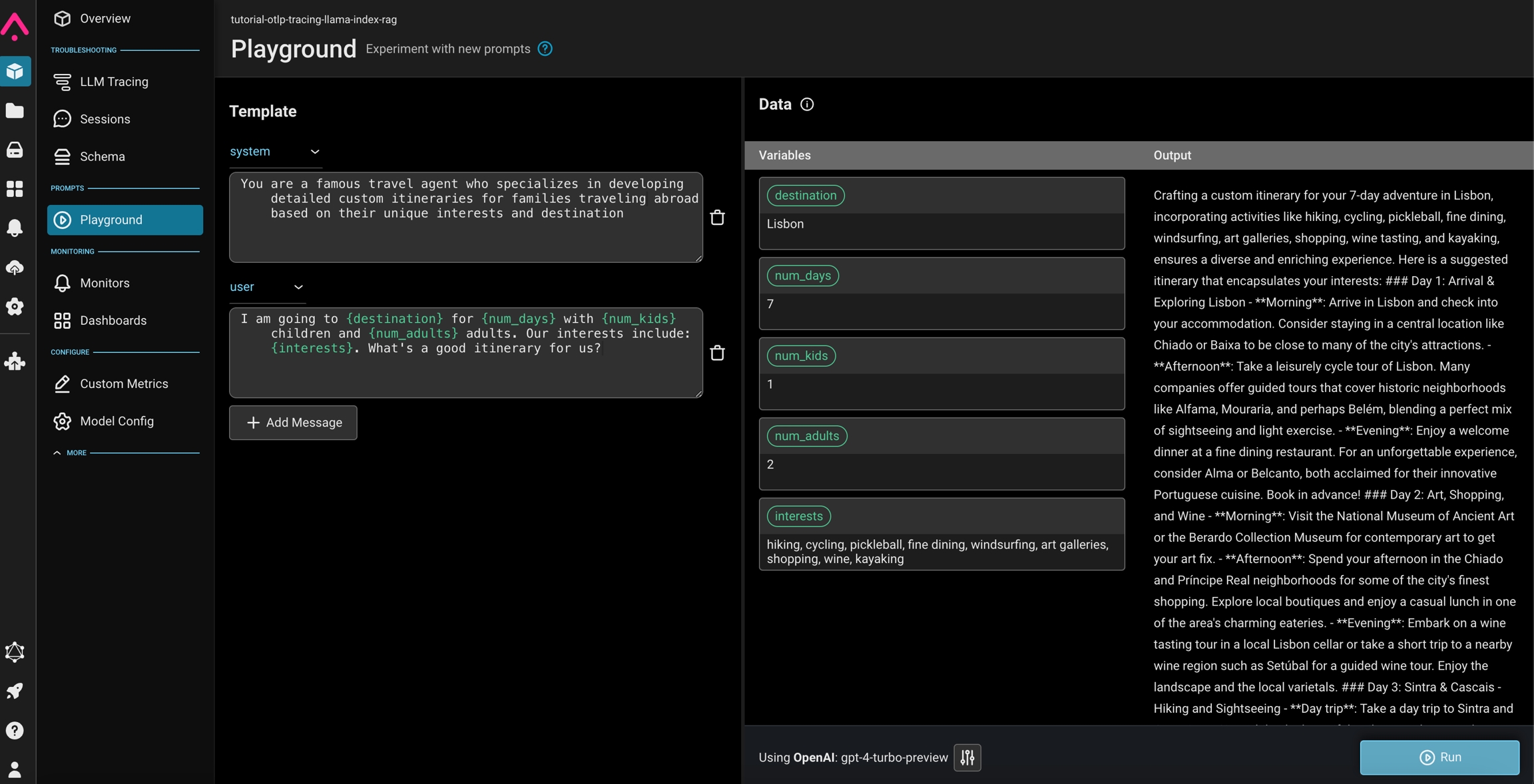 Prompt Playground has gotten a redesign to allow for better experimentation and customization of prompt templates and variables. Users can now chain together a series ofsystem and user messages to test the chatbot on a specific example, adding a list of input Variables in {mustache} notation and specifying their values in the Variables column. Learn more ->