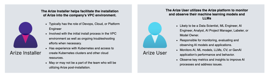 Arize has two key personas: the Arize Installer, typically a DevOps or Cloud Engineer responsible for installing and managing Arize in the VPC environment, and the Arize User, such as an ML or LLM Engineer, who monitors and evaluates AI models or agents using the platform. While the Installer handles setup and troubleshooting, the User focuses on performance insights and improving AI processes.