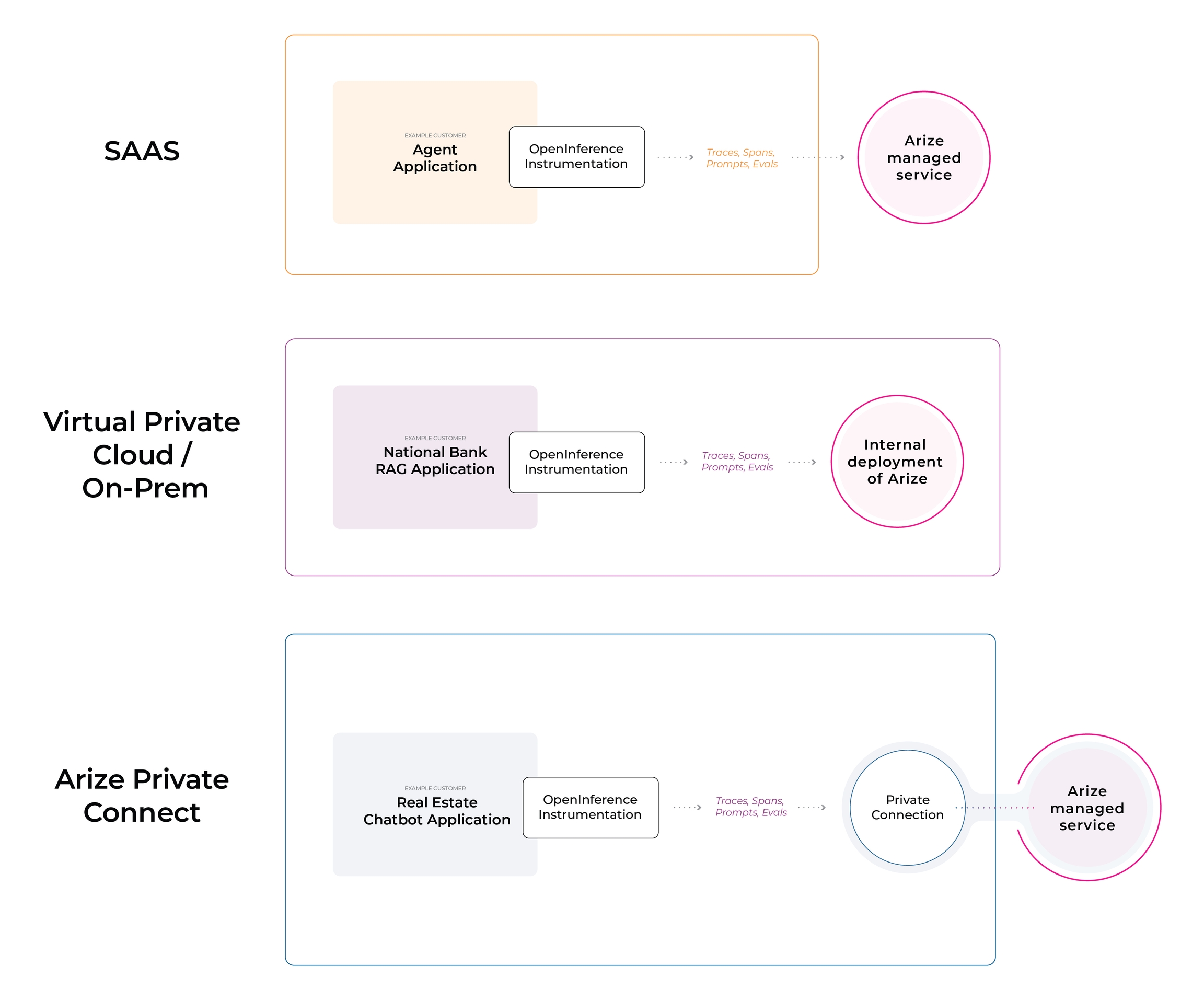 In the SAAS model, data is logged or periodically sent to Arize AX’s managed cloud infrastructure. The SAAS offering is also available with a Private Connect option that keeps the transmission of data within the cloud provider’s private network backbone. With the Self-Hosted Deployment (VPC/On-Prem), Arize is installed in the customer’s cloud of choice and data remains within their private VPC.